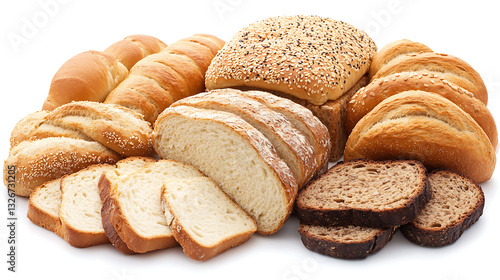 variety of freshly baked bread, including sliced white, whole grain, and seeded loaves, arranged white background. assortment showcases different textures and crust types, highlighting diversity