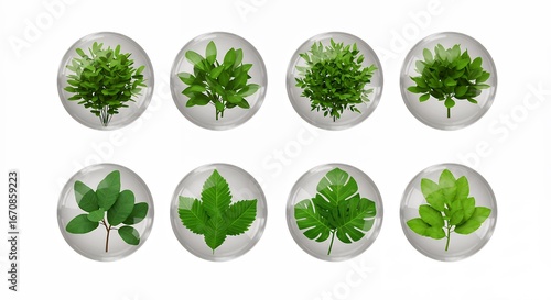Variety of green leaves in transparent containers