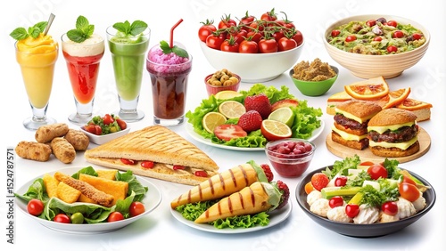 Variety of Healthy Foods and Drinks - Juices, Sandwiches, Salads, Burgers, and More