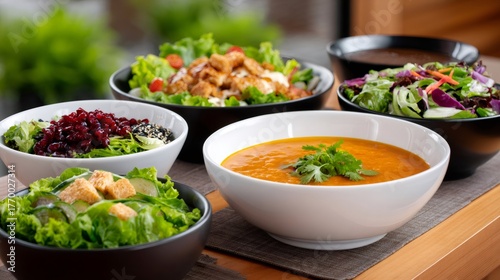 Variety of healthy meal bowls with soup and salads