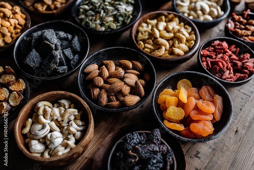 Variety of Healthy Nuts Seeds and Dried Fruits in Bowls Wooden Background Natural Food Image Delicious Snack Mix red goji diet life dark high vegan