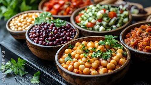 Variety of legumes and beans in wooden bowls with fresh herbs and vegetables, colorful healthy protein sources arranged on dark background for food photography.