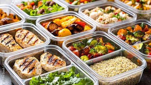 variety of meal prep containers filled with balanced portions of grilled chicken, quinoa, roasted veggies, and leafy greens, neatly arranged on a table. Healthy meal preparations