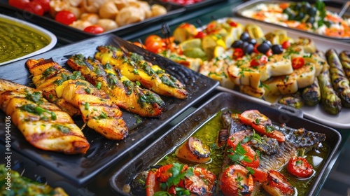 Variety of Mediterranean Asian and Spanish dishes Grilled veggies berries hake in a green sauce croquettes and vegetable samosas