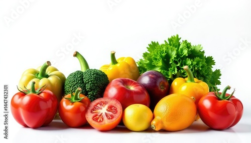 Variety of organic fruits and vegetables isolated on white, colorful, unprocessed, wellness