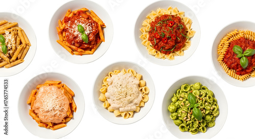 Variety of Pasta Dishes on White Background Italian Cuisine, Sauces, and Culinary Delights