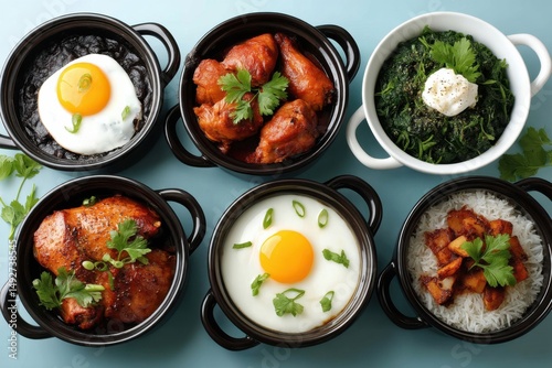 Variety of savory dishes served in black bowls featuring eggs, chicken, and greens on a blue background