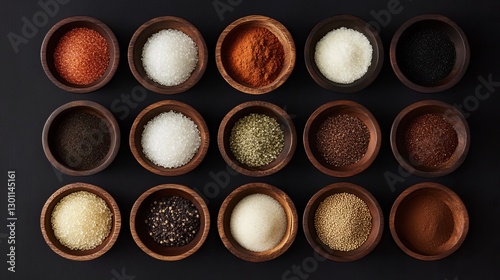 Variety of Spices and Salts in Wooden Bowls Dark Background Gourmet Food Photography Still Life Image Collection Natural Ingredients Culinary Herbs