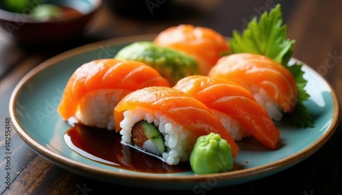Variety of sushi on a plate, soy sauce, wasabi, foodphotography, wasabi