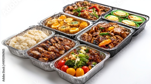 Variety of takeaway dishes in foil containers, including rice, chicken, vegetables, and egg rolls, presented on a white background for easy takeout meals.