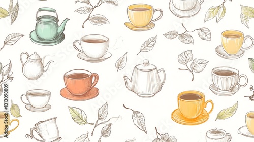 Variety of Tea Cups and Leaves Displayed in a Charming Pattern on a Light Background
