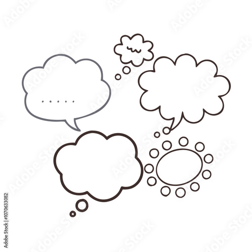 Variety of Thought Bubbles in Doodle Style, Illustration of different thought bubbles in a hand-drawn style, featuring blank, dotted, and expressive designs for creative conversation.