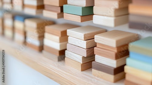 Variety of wood samples on display shelf