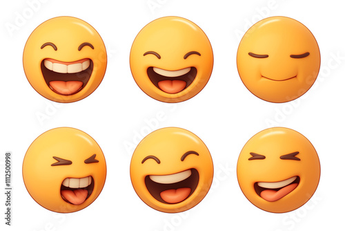 Various 3D cartoon emojis with different laughing expressions, including eyes closed and tongue out, isolated on white background. These playful and vibrant emojis convey joy and humor