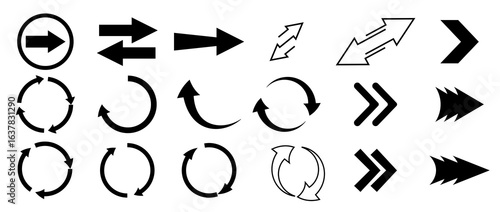 Various arrow symbols displayed on a white background. The collection includes straight, curved, and circular arrows pointing in multiple directions