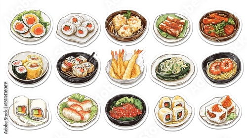 Various Asian dishes depicted on circular plates, showcasing sushi, tempura, dumplings, and other Asian-style cuisine. Hand-drawn style, colorful and detailed, with white plates
