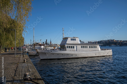 Various boats at the pier Norrmälarstrand at the bay Riddarfjärden in the district Kungsholmen, the tower of the Town City Hall a sunny color full autumn day in Stockholm