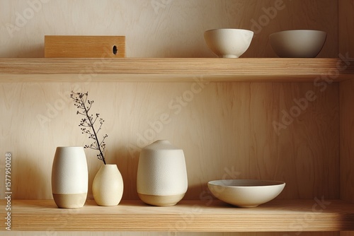 Various ceramic bowls, vases, and wooden box arranged on wooden shelves in a simple minimalist home interior with light wood.