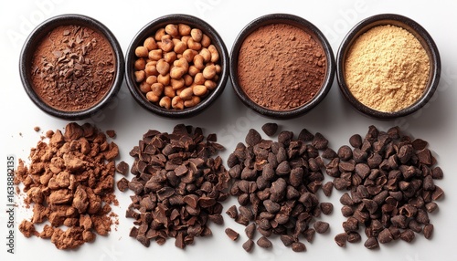 Various cocoa products in bowls and pile on a white surface. It is perfect for illustrating recipes, baking, or chocolate production.