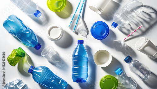 various collection of plastic bottle waste straws bottle caps with natural lighting on white background scattered