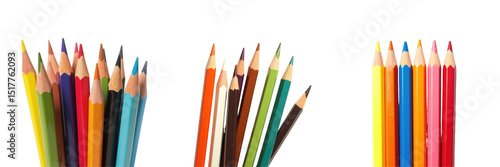 Various colored pencils arranged in groups isolated on a transparent background showcasing different colors and styles suitable for artistic and educational purposes.