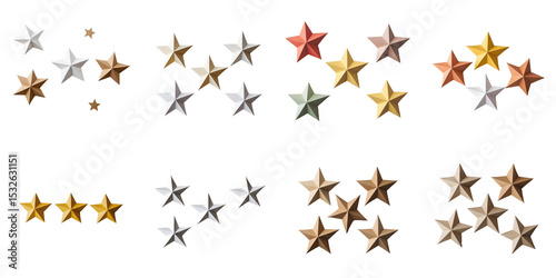 Various colored star-shaped paper stickers with different textures and finishes, isolated on a transparent background for versatile design applications.