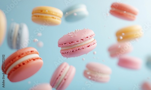 Various colorful of macarons floating on the air isolated on clean background, Desserts sweet cake concept, with, Generative AI