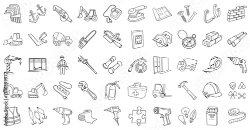 Various construction tools and equipment icons in outline style