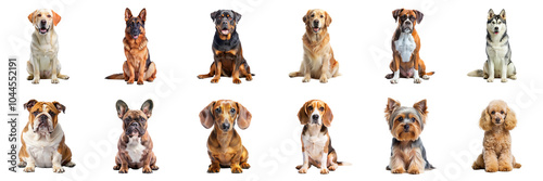 Various dog breeds sitting isolated on transparent background. Labrador, German Shepherd, Poodle, and more in PNG collection