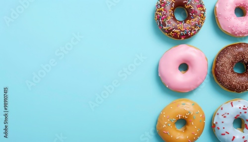 various donuts served on a blue background with a top view. Perfect for bakery, food, or snack related designs. Perfect for restaurant menus or social media posts. Generative AI