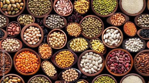 Various dried beans and lentils in wooden bowls on a black background SEAMLESS PATTERN