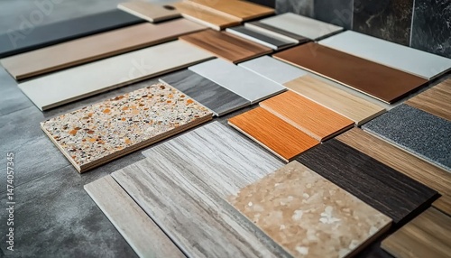 Various floor-tile samples with diverse textures and colors on a dark-gray background.