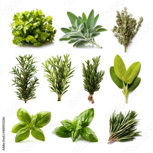 Various fresh culinary herbs assortment, close-up shot with individual isolated leaves