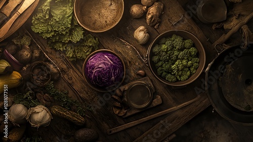 Various Fresh Vegetables and Ingredients on Wooden Table with Utensils