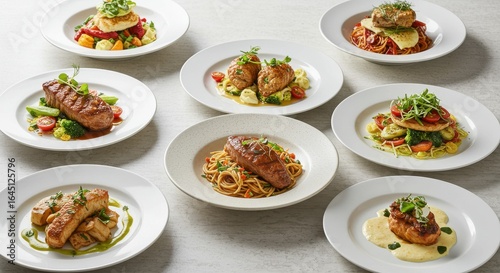 Various Gourmet Meal Dishes Served on Plates in Restaurant
