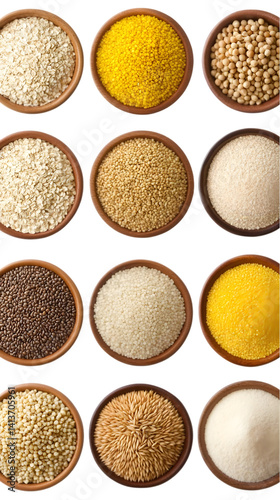 Various Grains in Wooden Bowls Isolated on Transparent Background