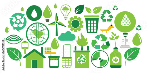 Various green and black symbols set against a white background, highlighting their unique shapes and patterns..eps