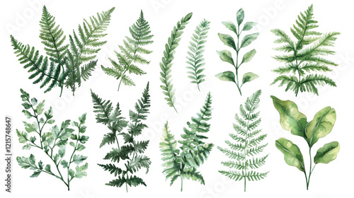 Various green fern leaves arranged artistically showcasing natural textures and shapes on transparency background