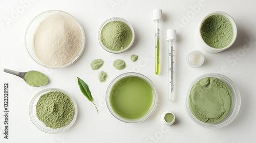 Various green powders and ingredients are arranged in circular containers on a white surface for a health and wellness project
