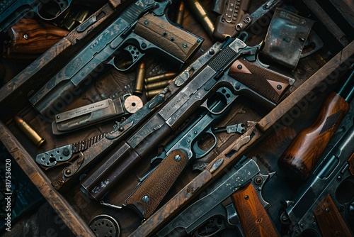Various guns neatly arranged inside a wooden box, including pistols, rifles, and shotguns