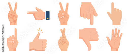 Various human hand gestures: peace, pointing, thumbs up, and more