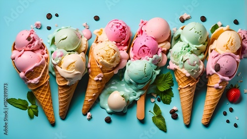 various ice cream scoops. A vibrant assortment of ice cream flavors. An isolated top view of ice cream with sauce and mint