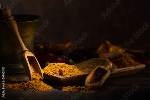 Various Indian spices with wooden spoons on a wooden table.