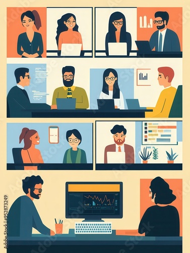 Various individuals are focused on their computer screens, participating in meetings and discussions in a modern office setting. Generative AI