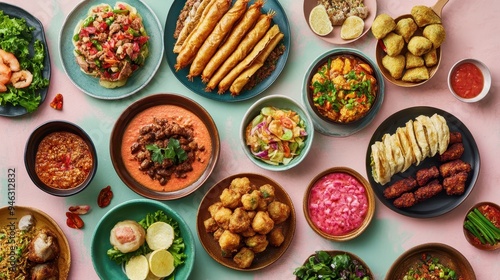 Various Indonesian dishes are beautifully arranged on colorful plates, celebrating local flavors in a vibrant flat lay