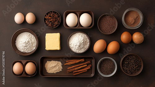Various Ingredients for Baking Flour Products on Dark Background with Space for Text. Flat Lay. Top View. Rustic Home Style. Flour, Eggs, Oil, Spices.