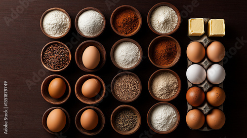 Various Ingredients for Baking Flour Products on Dark Background with Space for Text. Flat Lay. Top View. Rustic Home Style. Flour, Eggs, Oil, Spices.