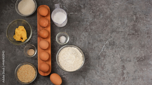 Various Ingredients for Baking Preparation on Cement Table. Making Bread Dough, Copy Space for text Recipe