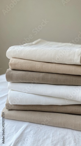 Various linen fabric swatches stacked neatly showcasing different shades of beige and white