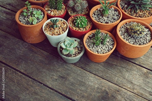 Various little succulent pot plants collection on vintage wood table with free space background, kalanchoe, dorestenia, echeveria, cactus, haworthia